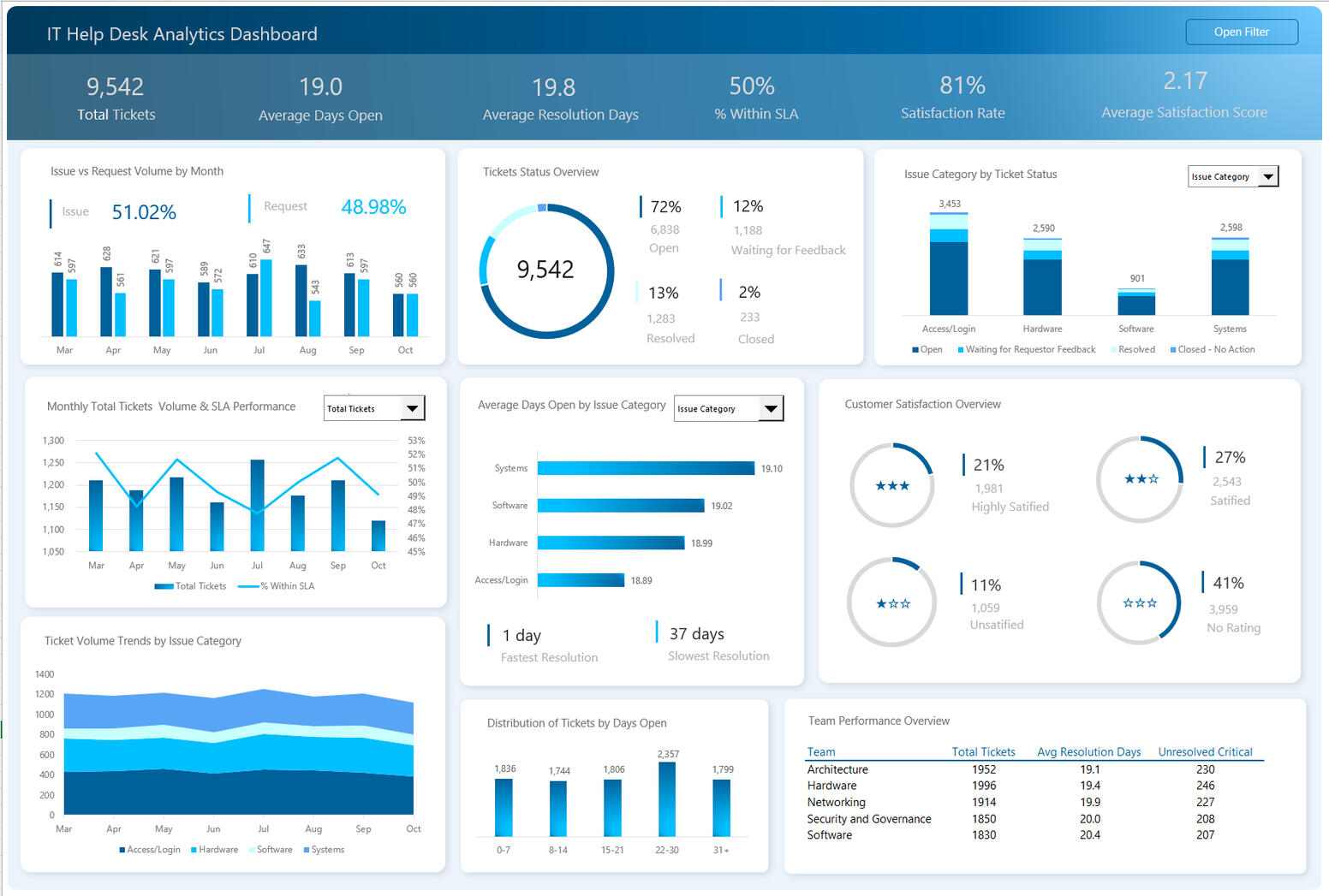Comprehensive Help Desk analytics project using Excel Power Query, Power Pivot, and DAX to transform ticket data into actionable business intelligence.