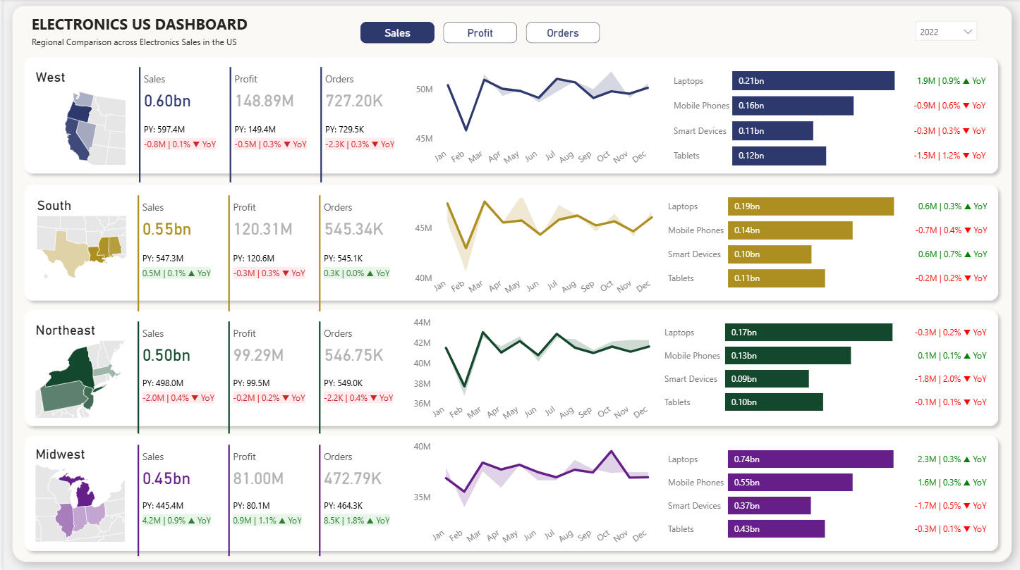 Questions this analysis answered:1. Which region generates the highest profitability?2. How has performance changed year-over-year?3. Which products drive the most revenue?4. Are there seasonal sales patterns?5. Which markets offer the best opportunities?---I took the following steps to create my analysis:1. Extracted 70,080 sales records covering 2021-2023 from the database2. Designed star schema data model with proper relationships3. Developed 51 custom DAX measures for dynamic calculations4. Implemented YoY comparison logic using SAMEPERIODLASTYEAR5. Created conditional formatting with region-specific colors6. Built interactive visualizations with metric switching7. Validated calculations through Python analysis8. Documented all measures for maintenance and transfer---Here are my key takeaways:1. West region leads with 25.1% profit margin—7.1 points higher than Midwest (17.9%)2. Three-year growth stagnation at $2.09B annually signals urgent need for intervention3. Uniform 21.5% margins across all products suggest commoditization4. Top Western states (NV, OR, CA, WA) deliver 25%+ margins vs. 19.9% in Northeast5. Minimal seasonality (±6%) indicates missed promotional opportunities