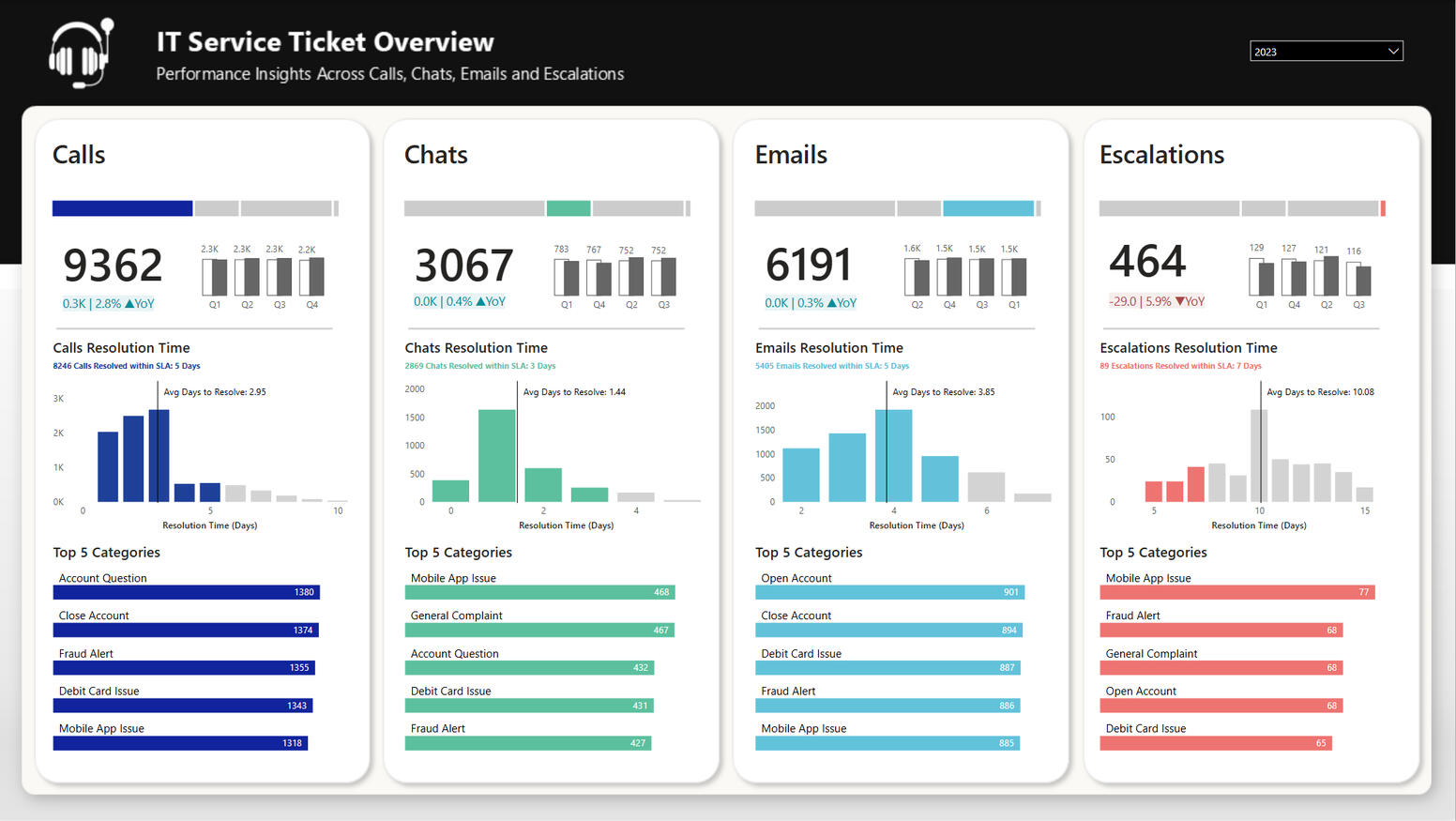 Questions this analysis answered:1. How has ticket volume evolved across all channels from 2021 to 2023?2. Which support channels consistently meet SLA targets and which underperform?3. What are the most common issue categories driving support volume?4. How do resolution times vary across different ticket types?5. What trends indicate improvement or deterioration in service quality?---I took the following steps to create my analysis:1. Extracted and validated 548,746 ticket records from ServiceNow system.2. Built Power BI data model with year, channel, and category dimensions.3. Created DAX measures for volume, SLA compliance, and resolution time calculations.4. Designed interactive dashboards with year-over-year trend analysis.5. Analyzed three-year patterns to identify performance gaps and opportunities.---Here are my key takeaways:1. Escalations critically underperform with only 18-21% SLA compliance and 10+ day resolution.2. Chats deliver fastest resolution at 1.41-1.45 days but represent only 15-16% of volume.3. Emails achieve highest SLA compliance at 91% with stable 3.65-day average resolution.4. Escalation volume decreased 5.9% YoY in 2023, indicating improved first-contact resolution.5. Mobile App Issues appear in top 5 across all channels, signaling product quality concerns.6. Chat channel is underutilized despite superior performance, representing expansion opportunity.7. Five categories drive 80%+ of volume: Debit Card, Mobile App, Account Questions, Fraud Alerts, Account Management.