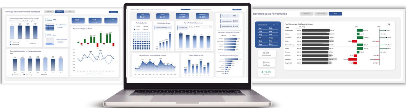 5.Implemented custom SVG visuals for segment badges and IBCS variance charts for year-over-year comparisons.