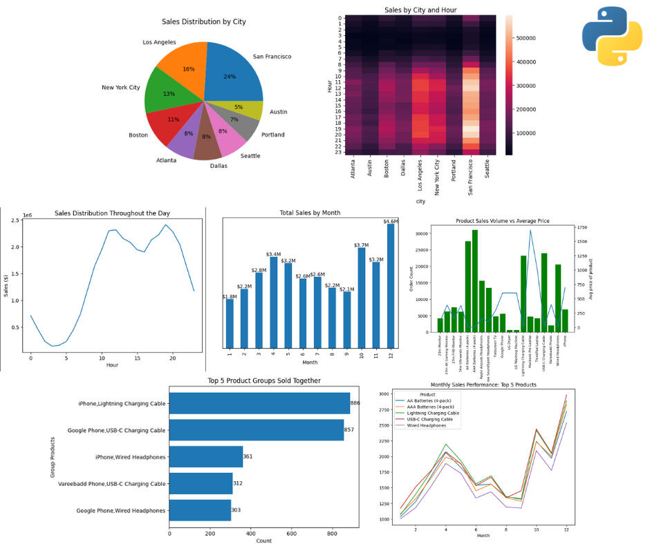 Analysis and visualization of sales data including monthly trends, hourly patterns, product groupings, and city-wise performance using Python and Matplotlib/Seaborn