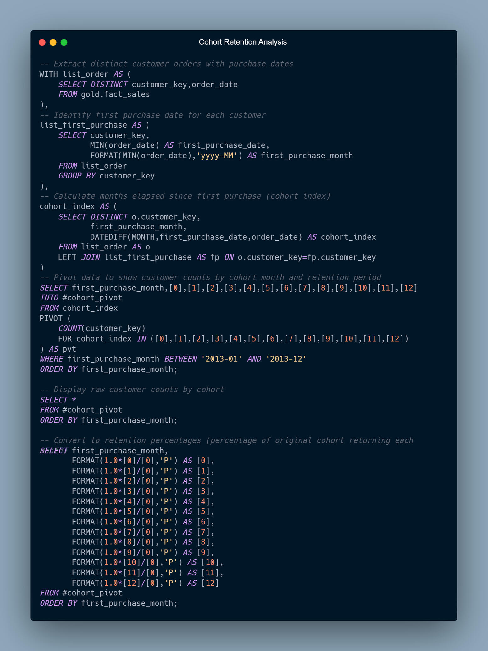 4. Built statistical visualizations including box plots, scatter matrices, and cohort analysis charts.