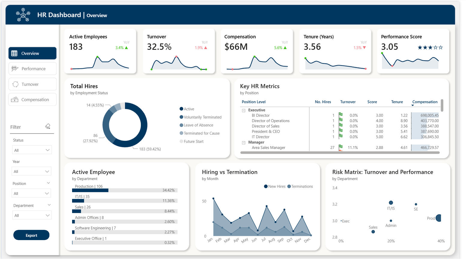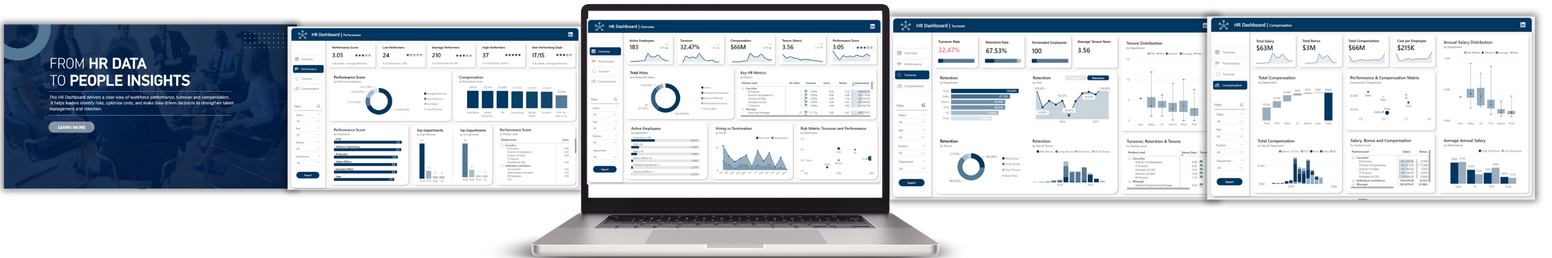 Questions this analysis answered:1. What is the current workforce composition and how has it changed over time?2. Which departments face the highest turnover risk?3. How does compensation correlate with performance and retention?4. What is the performance distribution across departments and positions?5. Where should we focus retention and development efforts?6. What is the average tenure and at what stage are we losing talent?7. How do our metrics compare to industry benchmarks?---I took the following steps to create my analysis:1. Extracted and cleaned employee data for 308 employees from HRIS system.2. Built star schema data model with fact and dimension tables.3. Created 70+ custom DAX measures for KPIs and analytics.4. Designed five dashboard pages with consistent formatting.5. Implemented conditional formatting and interactive visualizations.6. Benchmarked metrics against industry standards.7. Documented findings and strategic recommendations.---Here are my key takeaways:1. Turnover rate of 32.47% exceeds industry benchmark. Production department shows 40% attrition.2. 68% of employees are average performers. Only 12% are high performers.3. Production department (34% of workforce) is the highest risk area.4. IT/IS is the top performing department with 3.2 score and 80% retention.5. Average tenure of 3.56 years indicates mid-career departures.6. Inverted termination pattern suggests systematic hiring issues.7. Sales department has lowest performance at 2.9 score.8. Risk matrix identifies clear departmental priorities for intervention.9. Executive Office has 100% retention and strong stability.10. Integrated dashboard reveals interconnected HR patterns across all metrics.