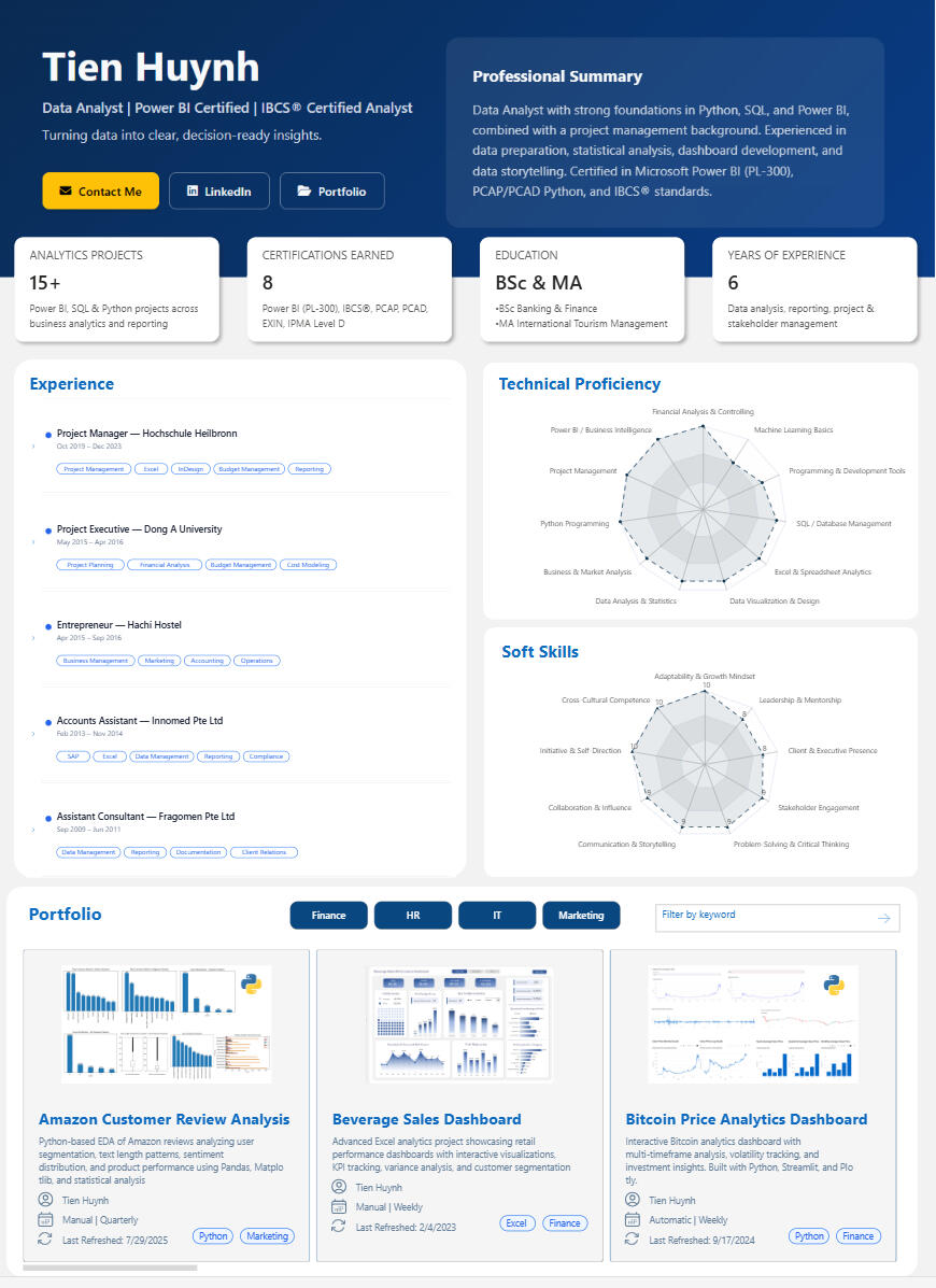 Hi! I'm Tien 👋I turn data into decisions.As a certified Data Analyst with a project management background, I create Power BI dashboards and Python analyses that help companies understand their story.I've worked across Germany, Singapore, and Vietnam – bringing international perspective to every dataset I touch.Let's make your data work for you.